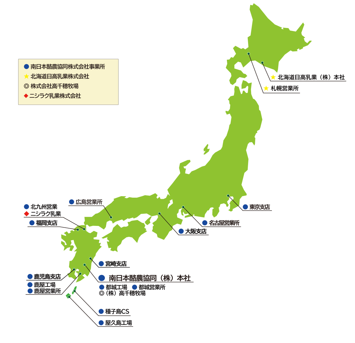| 北九州営業所 | 〒800-0231 福岡県北九州市小倉南区大字朽網3914番地5 ニシラク乳業株式会社内 | TEL:093-473-7131 FAX:093-473-7135 |